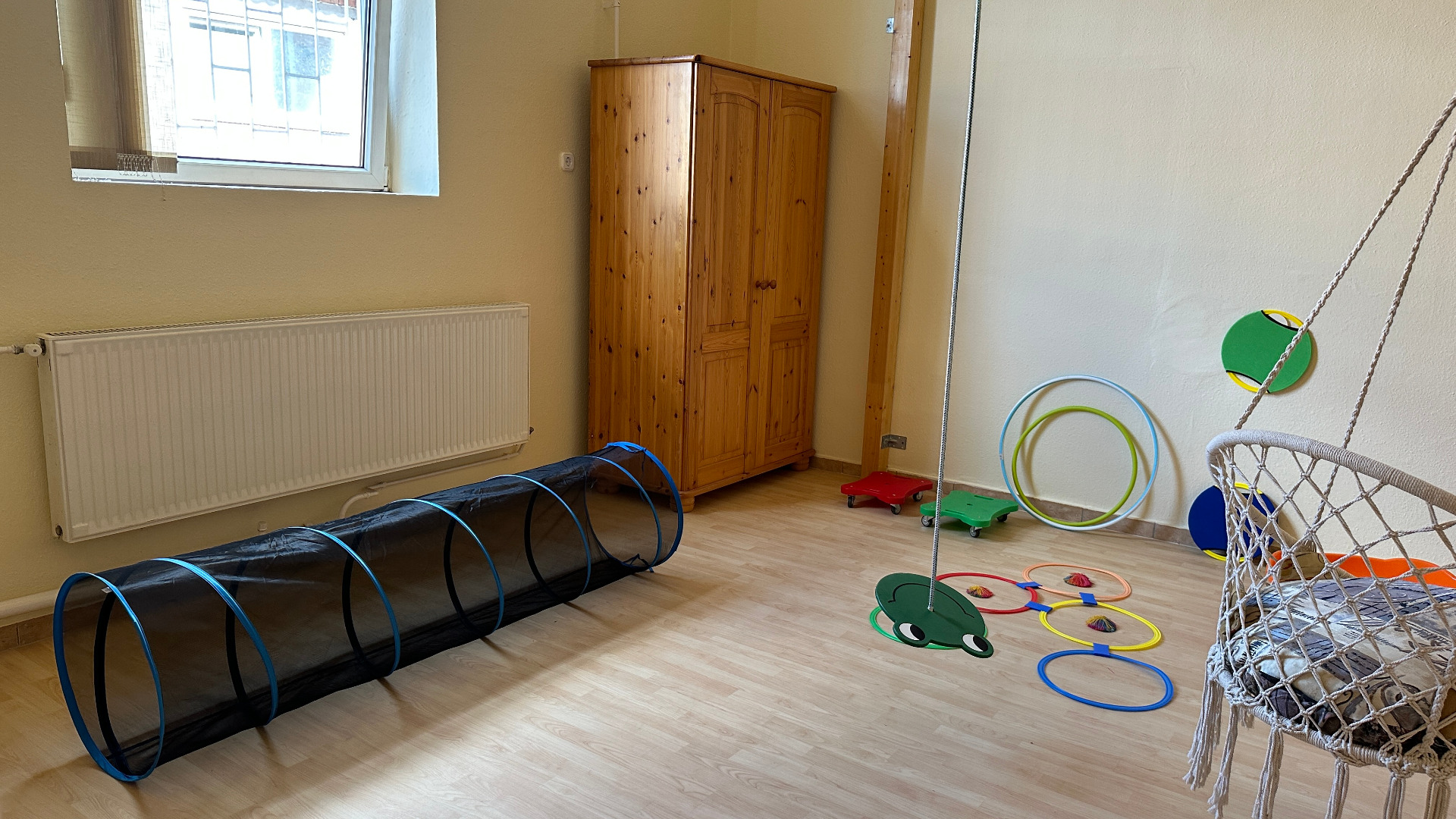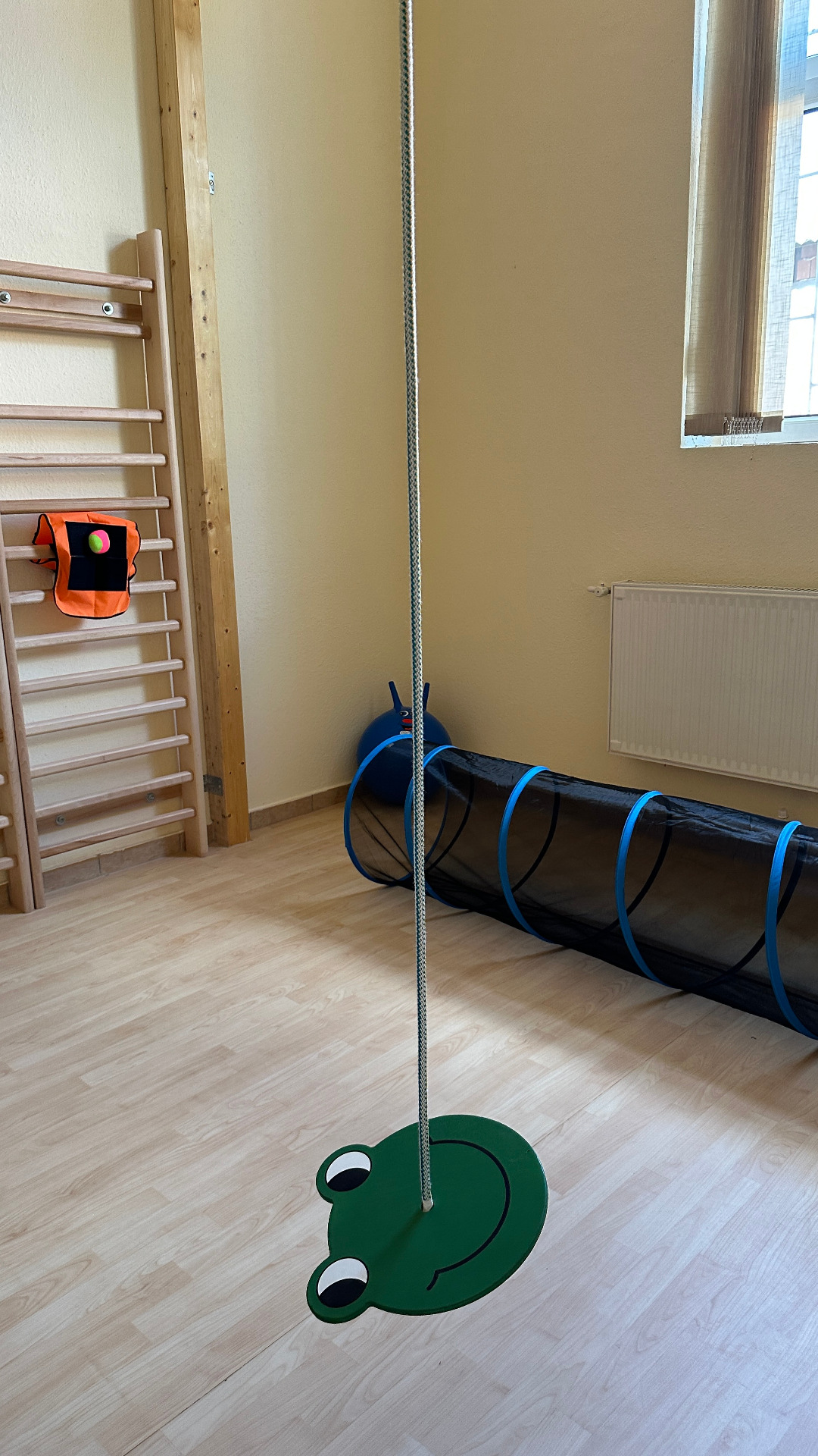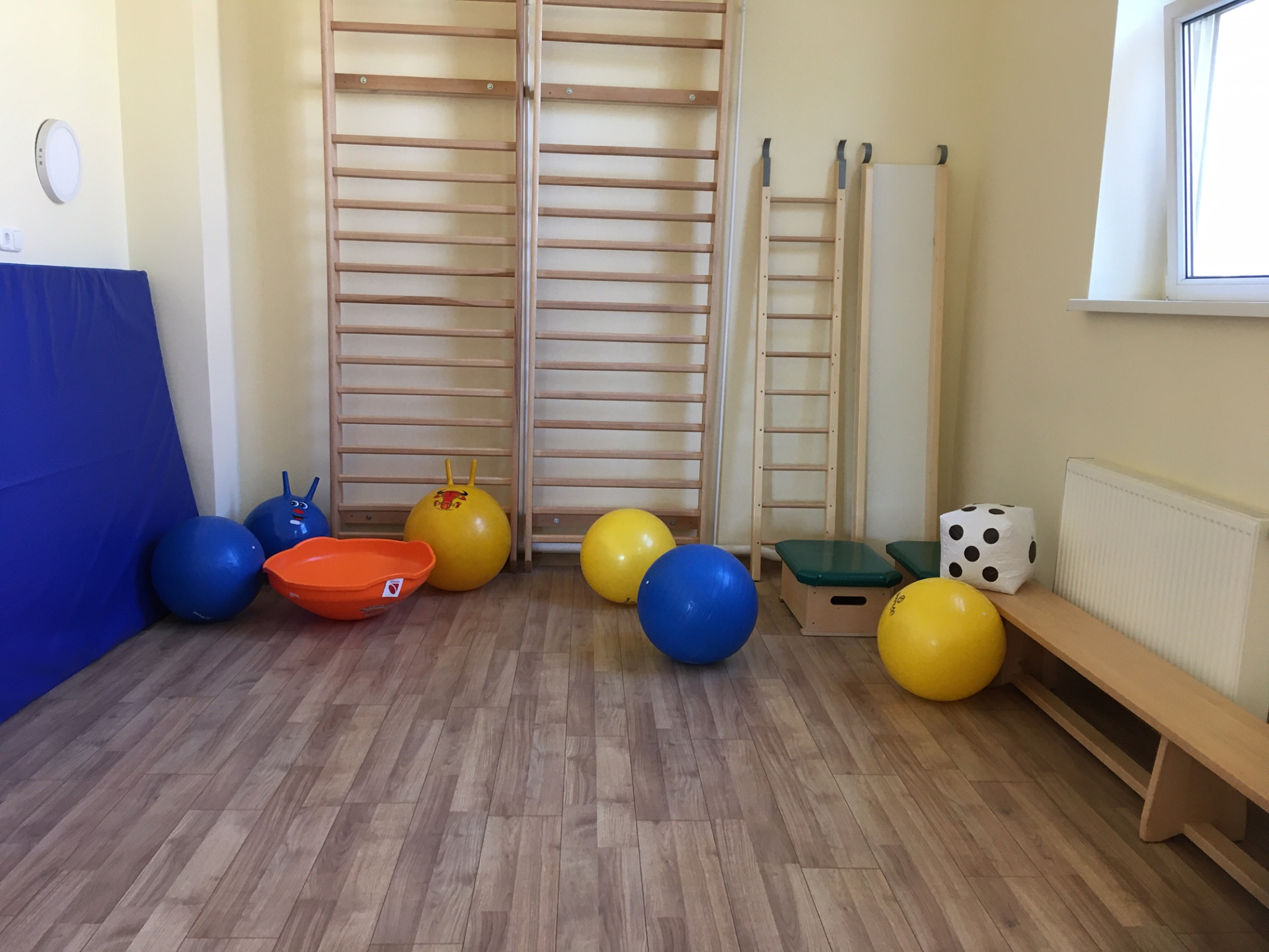 Szalagparkettás kialakítású nagy légterű mozgásfejlesztő terem, belmagassága 4 méter 2 nagy ablakkal, 2 felnőtt bordásfallal és sok eszközzel felszerelve, melyeket folyamatosan bővítünk.