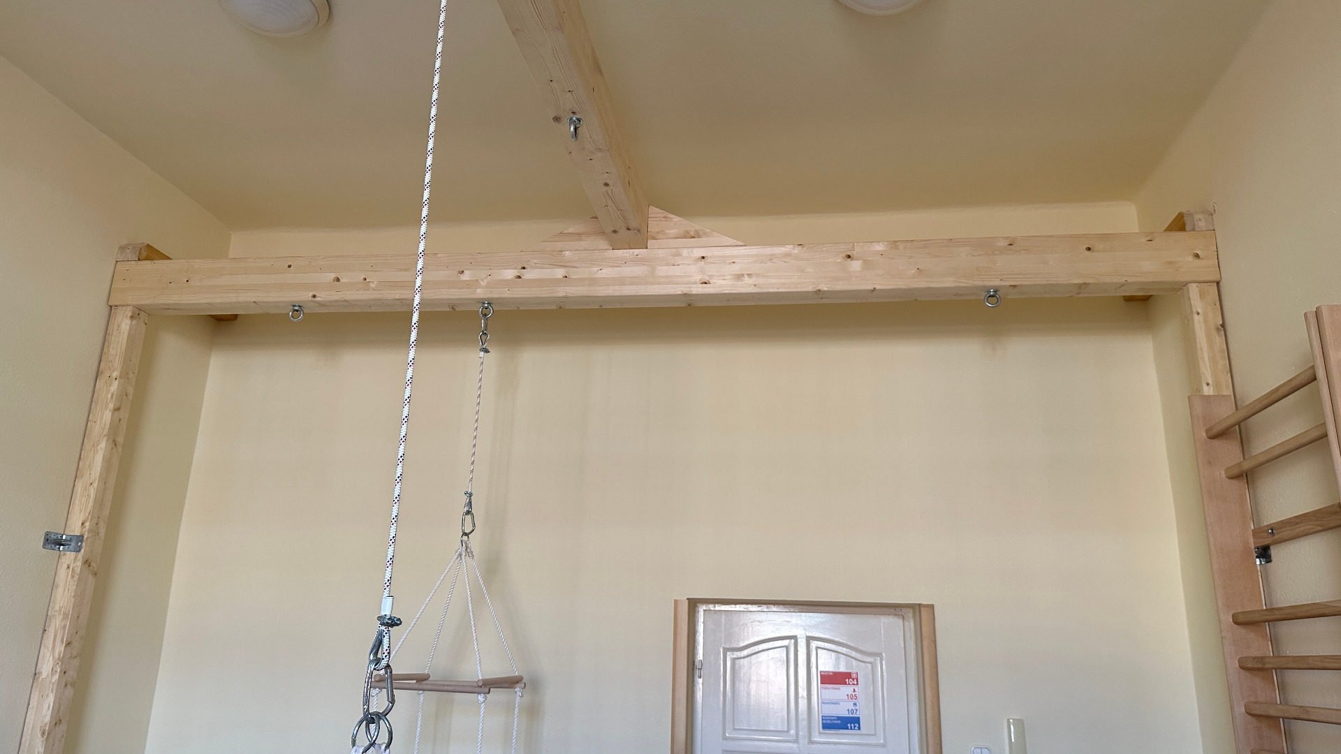 10 mm vastag parkettamintás sportpadlós kialakítású fa gerendázattal megépített, nagy légterű mozgásfejlesztő terem, belmagassága 4 méter. Hinták számára kialakított terem 2 felnőtt és 2 óvodai bordásfallal, sok eszközzel felszerelve, melyeket folyamatosan bővítünk.